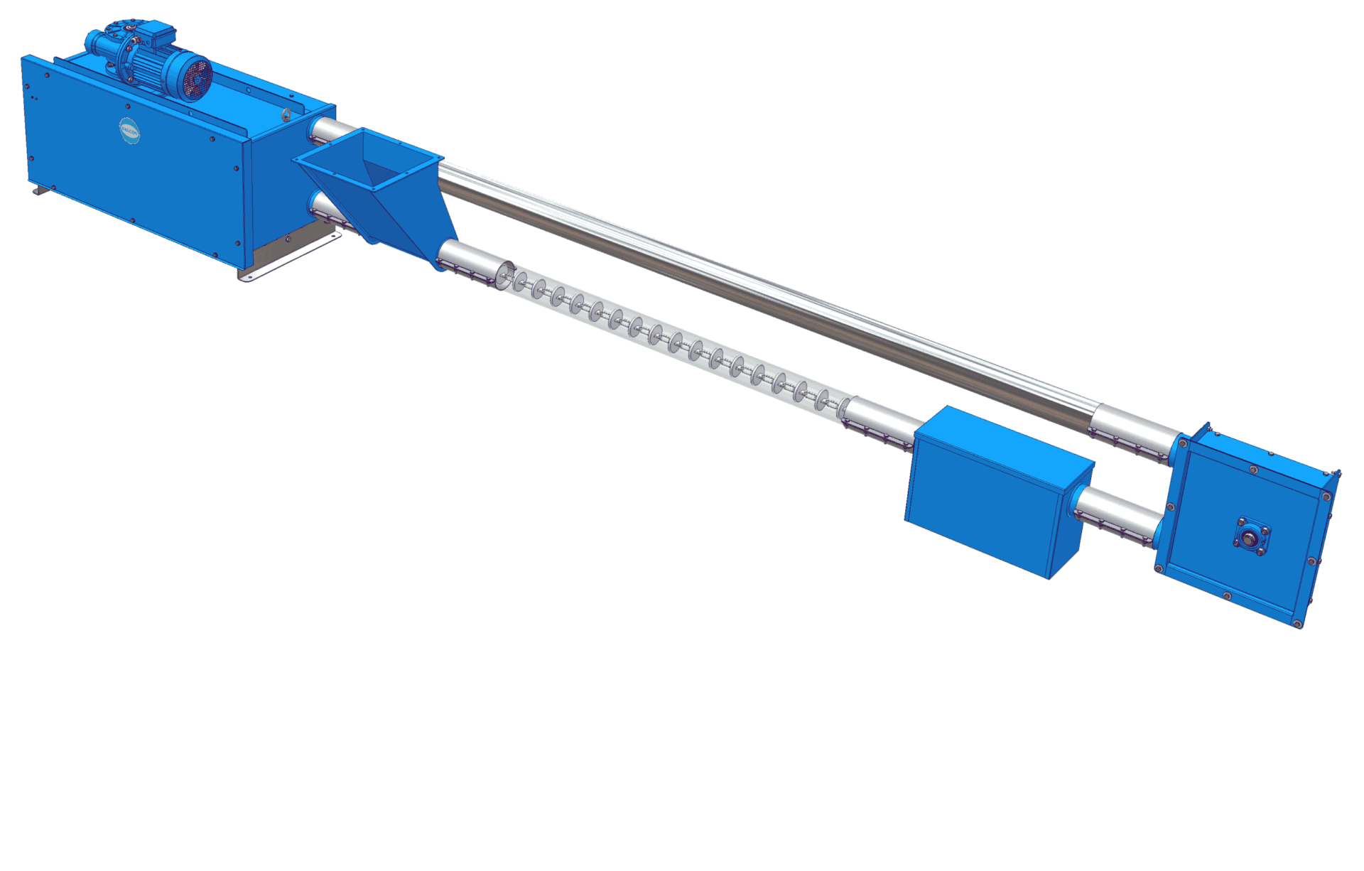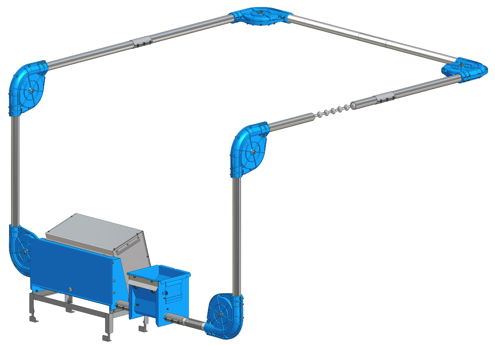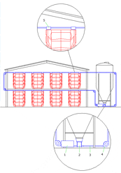 Falcon Feed Systems, thanks to their great flexibility, can carry out very complex paths, which are difficult to achieve with traditional flex auger conveyor systems. In the most complete configuration, it is possible to create a system with a maximum capacity of 12 tons / hour, with very low power, which varies from 1.5 to 4 HP per circuit. With the same conveyor, it is possible to connect one or more collection silos and distribute the feed on one or two floors.
